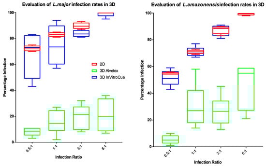 Box and whisker plots showing the infection rates of L. major (left) and L. amazonensis (right) in 2D (n = 6) or 3D (n = 6) cell cultures, using Invitrocue or Alvetex scaffolds. Infection ratio = Parasites: Cells, Red = 2D, Blue = 3D Invitrocue scaffold and Green = 3D Alvetex scaffold. Error bars show minimum and maximum values.