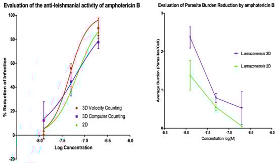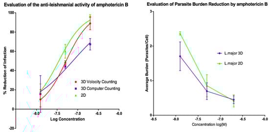 (Left) Dose-response curves for 2D (n = 6) and 3D (n = 6) cell culture showing the reduction in percentage infection of PEMs with L. amazonensis produced by treatment using amphotericin B. The percentage reduction in infection calculated based on total infection seen in the untreated controls in either condition. (Right) Reduction in L. amazonensis parasite burden of PEMs for 2D (n = 6) and 3D (n = 6) cell culture, produced by exposure to amphotericin B. Error bars show standard deviation.
