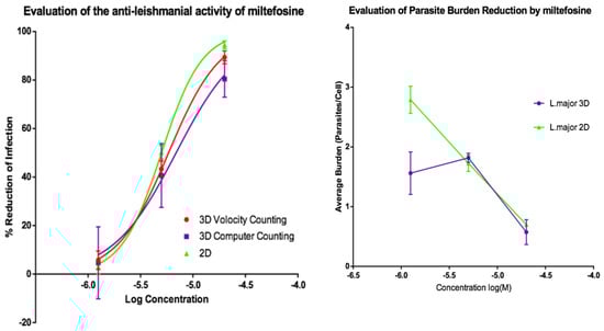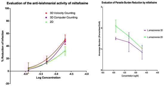 (Left) Dose-response curves for 2D (n = 6) and 3D (n = 6) cell culture showing the reduction in percentage infection of PEMs with L. amazonensis produced by dosing with miltefosine. The percentage reduction in infection calculated based on total infection seen in the untreated controls in either condition. (Right) Reduction in L. amazonensis parasite burden of PEMs for 2D (n = 6) and 3D (n = 6) cell culture, produced by dosing with miltefosine. Error bars show standard deviation.