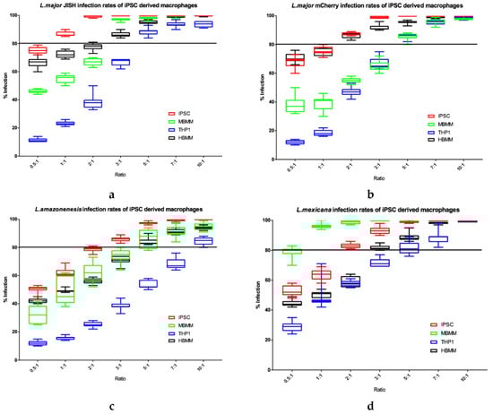 Percentage infections of L. major JISH (a), L. major mCherry (b), L. amazonensis (c) and L. mexicana (d) after 72 h incubation in each of the four cell types. n = 9. Line is drawn at 80% infection. Error bars show minimum and maximum values.