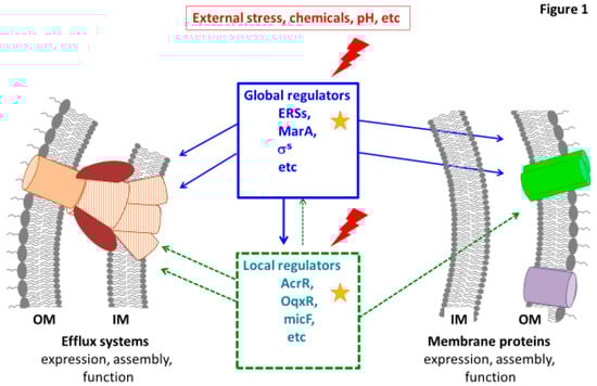 Regarding the drug transporters, multidrug efflux pumps encoded on the bacterial genomes belong to the ABC, MFS, SMR, MATE, PACE, and RND (super)families. Except for the ABC transporters, which use the ATP as an energy source to transport the drugs across the membrane, the other described multidrug efflux pumps are H+(or Na+)/drug antiporters []. These transporters carry drugs from the cytoplasm or the inner leaflet of the IM to the periplasm or to external medium with tripartite systems that comprise an inner membrane transporter (ABC, MFS, or RND), a periplasmic adaptor protein (PAP, previously known as the MFP for Membrane Fusion Protein), and an outer membrane channel (OMF, Outer Membrane Factor) [,]. The RND family contributes to the major membrane-associated mechanisms of efflux in Enterobacteriaceae and the more relevant complex described in clinical isolate belong to AcrAB-TolC system [,]. Importantly, due to their role in the bacterial adaptation to external stresses, these passive and active transports are tightly regulated in Enterobacteriaceae. It is mandatory to point out some key regulators present in different regulation cascades that can efficiently coordinate/balance the respective expression of passive diffusion and active expel of toxic compounds (Figure 1). The aim of this review is to discuss the key role of global transcriptional regulators including the XylS/AraC family members (Mar, Sox, Rob, Ram), and major Environmental Stress Response (ESR) systems, including two-component systems (TCS), in the emergence/spreading of membrane-associated mechanisms of resistance (MAMR) in clinical strains.