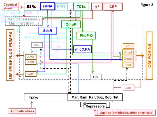 Figure 2 portrays this complex schema with the different actors /factors/regulators that can balance the entry/expel fluxes (Influx vs. Efflux). It is important to mention that in addition to antibiotics, several other molecules such as antimicrobial peptides, disinfectants, pesticides, detergents, etc., can trigger the bacterial response and induce MAMR [,,,]. This explains why ESR systems are involved or contribute in the sensing and transmission of internal signal that activate the genetic cascades controlling the envelope permeability and transports. Consequently, the TCS systems have been proposed as new target for original antibacterial agents in order to impair the bacterial adaptation and virulence [,,,,]. In the same way, targeting sRNAs is currently being considered in view of their central implication in the regulatory network leading to antibiotic resistance [,]. An inhibitor of sRNA-Hfq (chaperone protein of sRNAs interaction with mRNA) interaction has been identified []. A recent paper describes the possibility to inhibit the trigger of antibiotic resistance by using LexA target to inhibit the SOS response involved in fluoroquinolone and drug persisters [,,]. However, it must be noted that the redundancy of the regulatory network may imply that bacteria use a different pathway or acquire new mutations to hijack the effect of the drug [], thus a better knowledge of the whole network is needed.