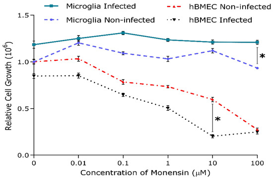Microglia and hBMEC cultures showed different sensitivity to monensin. Relative growth of each cell line was assessed by the sulforhodamine B (SRB) assay. The relative absorbance values of infected and treated cells were compared to non-infected and treated (control) cells. A significant decrease in cell number was observed in infected and uninfected hBMECs with increasing monensin concentration compared to microglia cultures. Data represent mean values (± SEM) of five replicates from three independent experiments for each cell line. Multiple Student t-tests; *, p < 0.05.