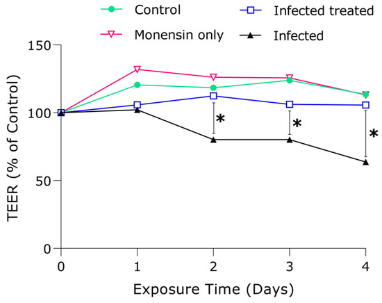 We investigated how hBMEC integrity was affected by T. gondii infection and/or modulated by Wnt inhibition via exposure to 0.1 µM monensin. The effect of monensin on the TEER of infected and uninfected hBMECs was monitored over 4 days. At one day post infection, there was no significant (p ≥ 0.05; t-tests) difference between T. gondii-infected cells treated with 0.1 µM monensin compared to infected + untreated, probably because it takes about a day for infection to establish. However, from day 2 after infection there was a significant decrease in hBMECs’ TEER between 0.1 µM monensin-treated and untreated infected cells. Interestingly, infected and treated cells did not show any significant difference throughout the entire experiment, suggesting that cell integrity was maintained by monensin treatment, possibly via inhibiting the damage caused by the parasite growth (Figure 3). On the contrary, the infected and untreated cells showed a significant reduction in TEER readings compared to the infected and treated cells (p < 0.05), suggesting that T. gondii infection significantly compromised host cell integrity. There was a 38.2% decrease in the resistance of infected + untreated cells compared to infected + treated cells relative to the control cells. Interestingly, hBMECs’ resistance did not change significantly from day to day and cell integrity was generally stable over the time period for control, infected + treated, and 0.1 µM monensin only groups. These findings are in line with the results of the anti-T. gondii effect of monensin (Figure 1 and Figure 2), suggesting that monensin had offset the cellular damage through inhibition of the parasite growth within the hBMECs and, hence, enhanced the recovery of cell integrity, leading to better endothelial resistance than infected + untreated cells.