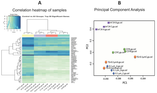 (A) A heatmap showing the correlation between all 12 microarray transcriptome expression profiles based on the top 50 most significantly expressed genes. Shades of light green and dark blue represent low and high correlation, respectively. Based on the dendrogram, four groups of the 12 sample expression profiles were clustered into four distinct clusters, where three samples within each group had similar expression profiles. (B) Principal component analysis (PCA) plot also shows that samples within each group were similar to each other, with the only exception being the dataset of TG_Monensin group samples.