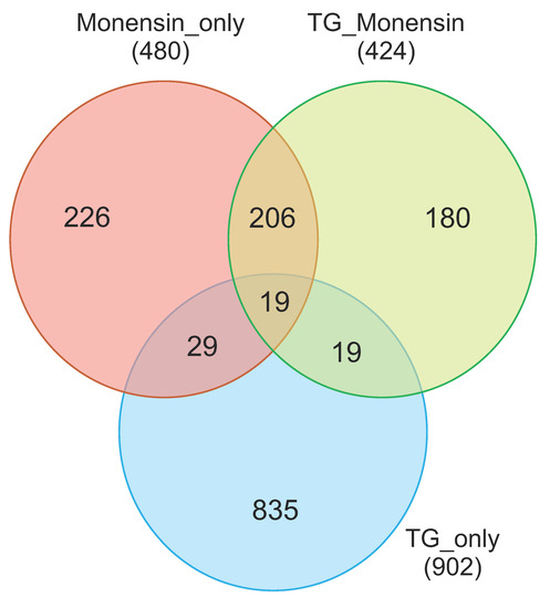 Three-way Venn diagram comparing expression profiles of Control vs. TG_only, Control vs. Monensin_only and Control vs. TG_Monensin. Numbers in the overlapped areas (i.e. at the intersection of the circles) represent DEGs shared between groups. The shaded area in the middle represents 19 DEGs shared between the three groups (Table S1).