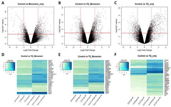 (A–C) Volcano plots showing the expression profile of hBMECs treated with 0.1 μM monensin (Monensin_only), hBMECs treated with 0.1 μM monensin + infected by T. gondii (TG_Monensin), and hBMECs infected by T. gondii (TG_only), compared to control hBMECs. The red horizontal line represents a cut-off value of p < 0.05 and the vertical dash red lines represent the log2 FC cut-off value of ≤ −1 (downregulated) or ≥ 1 (upregulated). Generally, more upregulated genes passed both cut-off values than down-regulated genes. (D–F) Correlation heatmaps of the top 30 most significant DEGs following treatment with monensin, following treatment + infection, and following infection, compared to control. The rows represent DEGs and the columns represent the 12 examined samples. The dendrogram shows a high intra-sample correlation between each group for all groups. Genes labelled as NA (not available) denote unpublished genes or uncharacterized non-coding RNA genes without annotation.