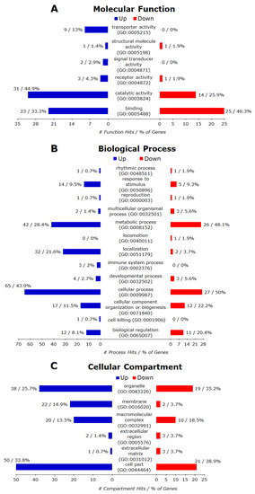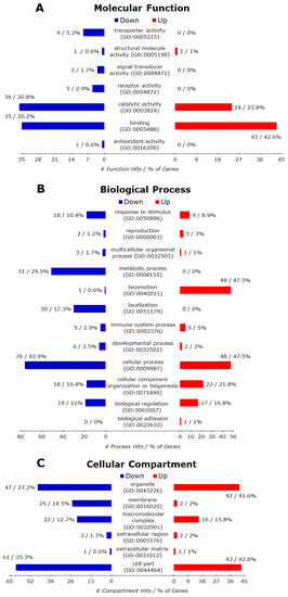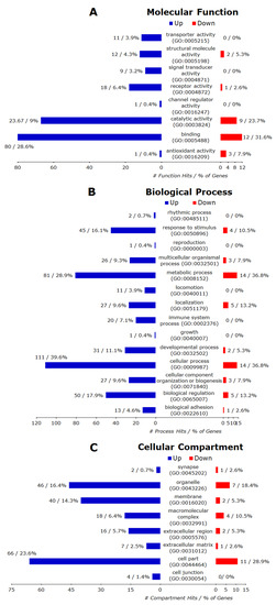 Of 345 annotated up-regulated genes, only 280 were recognized by the PANTHER database and the hits for all GO annotations (BP MF, CC) and their major categories were presented in Figure 9A–C, respectively. Overall, these up-regulated genes matched to 14 BP terms (biological adhesion, biological regulation, cellular component organization or biogenesis, cellular process, developmental process, growth, immune system process, localization, locomotion, metabolic process, multicellular organismal process, reproduction, response to stimulus, rhythmic process), eight MF terms (antioxidant activity, binding, catalytic activity, channel regulator activity, receptor activity, signal transducer activity, structural molecule activity, transporter activity) and eight CC terms (cell junction, cell part, extracellular matrix, extracellular region, macromolecular complex, membrane, organelle, synapse). Further analysis with the PANTHER Overrepresentation Test found BP to be significantly enriched, but there were no significantly enriched MF or CC (FDR < 0.05).