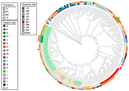 The phylogeny was dominated by phylogroup A strains, separated from all other phylogroups on one major clade. The phylogroup A clade contained seven of the nine most common STs, five of which were shared between the 2017 and 2007 collections. Sequence types belonging to the ST10 complex were mostly clustered together, except for ST34, which split two clusters of ST10 and a cluster of three ST48s that were distinct from the other ST48s in the collection.