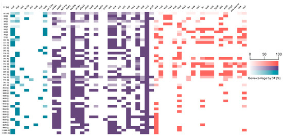 Heat map showing proportion of sequence types (STs) carrying plasmid replicons (aqua), antimicrobial resistance genes (purple) and virulence-associated genes (red). For the full dataset see Supplementary Tables S2–S4.
