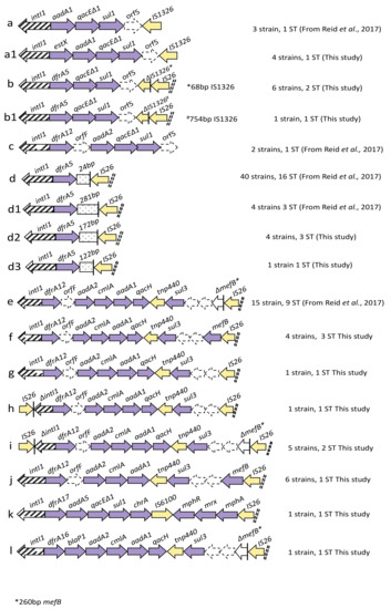 Schematic representation of class 1 integron structures (labeled a-l) present in the sequenced genomes. Arrows represent open reading frames (ORFs). Purple and yellow arrows represent antimicrobial resistance genes (ARGs) and insertion sequences, respectively. Arrows with dashed lines indicate hypothetical proteins. Diagonal dashed double lines represent scaffold breaks in the sequence.