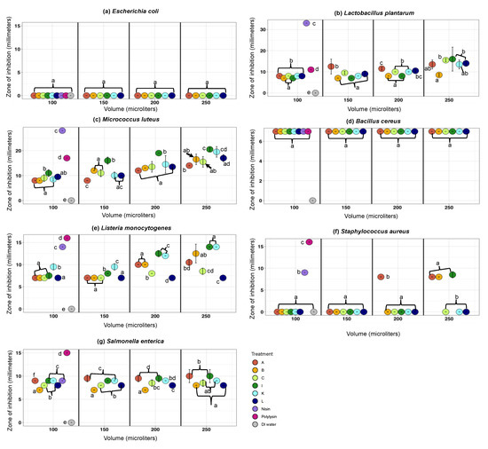 Comparison of the antimicrobial activity spectra of artisanal kefirs from Fusion Tea (A, Amazon); Britain (B); the Caucasus region (C); Ireland (I); South Korea (K); and Lithuania (L) against (a) Escherichia coli ATCC 12435, (b) Lactobacillus plantarum NCDO 995, (c) Micrococcus luteus ATCC 10420, (d) Bacillus cereus ATCC 14579, (e) Listeria monocytogenes CWD 1198, (f) Staphylococcus aureus ATCC 25923, and (g) Salmonella enterica serovar Enteritidis ATCC 13076 using the agar well diffusion method. A range of filter-sterilized artisanal kefir volumes (100 µL, 150 µL, 200 µL, and 250 µL) were placed inside the wells. Nisin (N; 220 IU) and polylysin (P; 200 IU) were used as positive controls in a volume of 100 µL. Sterilized DI water (100 µL) was used as a negative control. The diameter of the inhibition zones was measured in mm. All experiments were conducted two independent times and each time in duplicate. Different letters (a–f) indicate statistical pairwise comparisons between the treatments within each volume performed by post-hoc Tukey’s multiple comparison procedure. The same letter indicates no significant difference between the treatments within each volume.