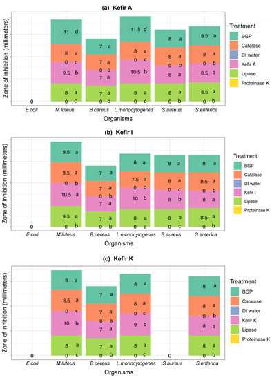 Bacteriocin-based antimicrobial activity in filter-sterilized artisanal kefir samples from (a) Fusion Tea (Kefir A), (b) Ireland (Kefir I), and (c) South Korea (Kefir K) against select indicator strains using β-glycerophosphate (BGP, teal), bovine liver catalase (coral), lipase from Aspergillus oryzae (lime green), and proteinase K from Tritirachium album (yellow). The agar well diffusion method was used. Sterile DI water (blue) was used as the negative control. Wells generated in each plate contained filter-sterilized artisanal kefir product (100 µL) with or without the additives mentioned above. The diameter of the inhibition zones was measured in mm after incubation for 24 h at 37 or 30 °C. Different letters (a–c) indicate statistical pairwise comparisons between the treatments for a given organism performed by post-hoc Tukey’s multiple comparison procedure. The same letter indicates no significant difference between treatments for a given organism.