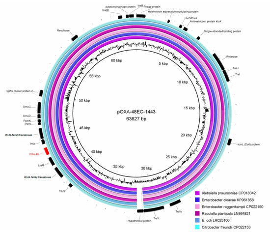 The transmissibility of the pOXA-48EC-1443 plasmid was investigated by filter mating assay. It was highly transmissible by conjugation into a broad range of Enterobacteriaceae (E. coli, Citrobacter freundii, Enterobacter asburiae, Klebsiella oxytoca, and Salmonella Typhimurium). Comparison of the plasmid genome with available pOXA-48-like sequences of GenBank (National Center for Biotechnology Information; NCBI) revealed a high degree of nucleotide identity (>99%) and coverage (94%) among the different plasmid genomes detected in Enterobacteriaceae (e.g., E. coli, LR025100; K. pneumoniae, CP018342; Citrobacter freundii, CP022153; Raoultella planticola, LN864821; Enterobacter roggenkampii, CP022150 or Enterobacter cloacae, KP061858) (Figure 1). The highest concordance (identity: 99.96%, coverage: 94%) was found to the plasmid of K. pneumoniae (Acc. no. CP018342.1) that was isolated during a nosocomial outbreak in Lower Saxony (Germany), in 2016. As previously reported, the blaOXA-48 gene of pOXA-48EC-1443 is associated with the Tn1999 transposon with no other foreign DNA being integrated at this locus [7].