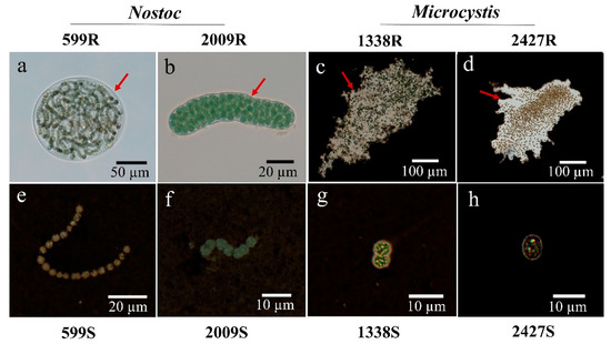 The morphology of Nostoc and Microcystis strains used in this study. (a,b) Nostoc embedded in sheath (arrows); (c,d) Microcystis embedded in slime with India ink staining (arrows); (e,f) sheath-stripped Nostoc in filamentous form with India ink staining; (g,h) slime-stripped Microcystis in unicellular form with India ink staining; R and S are the abbreviations for external-layer-retaining and stripped samples, respectively.