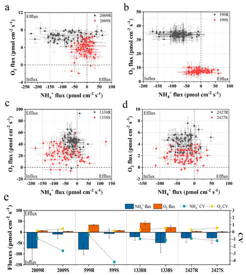 Scatter diagram and the average of NH4+ and O2 fluxes for 6 min of external-layer-retaining and stripped samples of Nostoc and Microcystis by noninvasive microtest technology (NMT). (a) N. sp. FACHB-2009; (b) N. sp. FACHB-599; (c) M. aeruginosa FACHB-1338; (d) M. sp. FACHB-2427; (e) the average value and coefficient of variation (CV); R and S are the abbreviations for external-layer-retaining and stripped samples, respectively. Data are means ± SEs (n = 6).