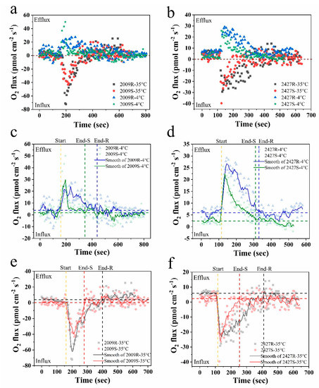 Cyanobacterial external layers, which are mainly composed of complex heteropolysaccharides, play an important physiological role in bloom formation and various types of stress tolerance during adverse conditions [9]. In this study, the real-time net O2 flux in N. sp. FACHB-2009 and M. sp. FACHB-2427 in external-layer-retaining and stripped samples were detected under instantaneous temperature shock at 4 °C and 35 °C, respectively (Figure 4a,b). The results showed that both retaining and stripped samples of Nostoc and Microcystis displayed remarkable O2 effluxes at 4 °C shock and O2 influxes at 35 °C, indicating a significant stimulation of respiration by 35 °C compared with 4 °C shock. We infer that this difference is due to the tendency of respiration to be more sensitive to temperature and to increase more than photosynthesis [42]. We then smoothed the response curves of net O2 fluxes over 10 min using the five point adjacent-averaging method. The temperature responses of the net O2 flux in all strains were unimodal, with rates rising up to a peak and declining thereafter at 4 °C shock (Figure 4c,d), whereas the complete reverse trend was observed at 35 °C shock (Figure 4e,f). Eventually, they all gradually returned to the initial state, which suggests that Nostoc and Microcystis have a temperature fluctuation tolerance over short time scales.