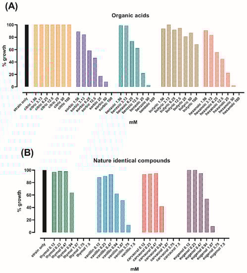 The antimicrobial activity of organic acids and NIC against S. typhimurium are reported in Figure 1A,B, respectively. Citric and butyric acid did not inhibit S. typhimurium, while the MIC value of sorbic, benzoic, and hexanoic acid was defined as 100 mM. All the tested NIC were effective at lower concentrations than organic acids. In particular, vanillin inhibited S. typhimurium at 7.5 mM, eugenol at 3.75 mM, and both thymol and carvacrol at 1.87 mM.