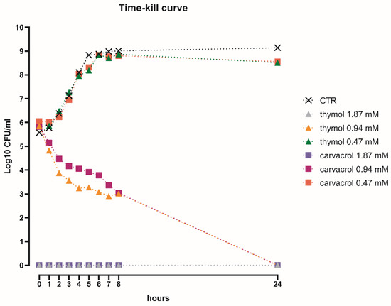 Time-kill curve of thymol or carvacrol 1.87, 0.94, and 0.47 mM against S. typhimurium.