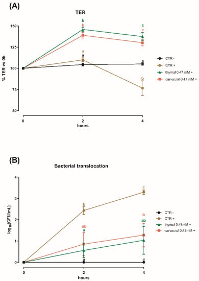 Cells were used for bacterial challenge 28 days after the seeding on filters, once TER values were stable. On day 28, TER was measured right before the start of the challenge and the cellular medium was removed and substituted with the same medium without P/S. Cells were apically challenged with S. typhimurium in exponential phase at a concentration of 105 CFU/mL with EtOH in a concentration equivalent to that found in the treated groups (challenged control, CTR+), and with either thymol or carvacrol at 0.47 mM (n = 5). A group in the same conditions of CTR+, but without bacterial challenge, was identified as the non-challenged control (CTR−). In order to determine the intestinal monolayer integrity and the infection process, TER and bacterial translocation were examined during a 4 h challenge at 2 and 4 h. For bacterial translocation, a 100 µL aliquot of the basolateral medium was collected, serially (10-fold) diluted in saline solution and seeded on BHI agar plates in order to count how many bacteria translocated from the apical to the basolateral side of the intestinal monolayer.