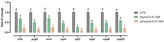 mRNA expression of hilA, prgH, invA, sipA, sipC, sipD, sopB, sopE2 from S. typhimurium cultures alone (CTR), and with either thymol or carvacrol 0.47 mM. Data are presented as mean ± SEM. Different letters indicate statistical significance with p < 0.05.