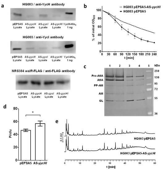 By reducing the abundance of YycH and YycI in S. aureus HG003 cells, a slower autolysis was observed. To test whether this is correlated to differences in muropeptide composition, cell walls from S. aureus HG003 containing the antisense plasmid pEPSA5-AS-yycHI and the empty vector were purified, digested with mutanolysin, and analyzed by UPLC. Exponentially growing cells of the YycHI antisense knockdown strain did not show any difference in their peptidoglycan patterns when compared to the empty vector strain (Figure 2e).