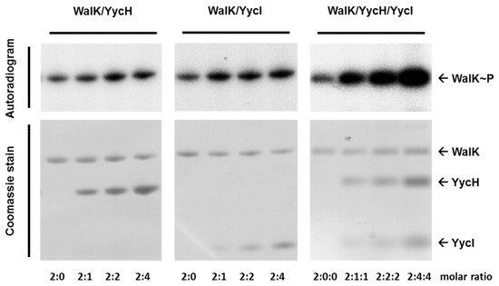 In addition to the characterization of the antisense yycHI strain, we wanted to show a direct impact of YycH and YycI on the autophosphorylation activity of WalK in vitro. Combinations of WalK, YycH, and YycI were reconstituted into phospholipid liposomes and the kinase activity was tested using [γ32P]-ATP, followed by SDS-PAGE. After autoradiography, the gels were stained with Coomassie Brilliant Blue R250. By increasing the ratio of both YycH and YycI, in relation to the WalK kinase, an increasing autophosphorylation activity was observed. In comparison to the liposomes harboring only the kinase, the signal was much stronger with the highest amount of YycH and YycI and a molar ratio of 1:2:2 for the WalK monomer/YycH/YycI (Figure 3). Liposomes containing increasing amounts of either YycH or YycI also showed a slight increase in WalK activity, however, WalK was less activated than in the liposomes containing both regulatory proteins.