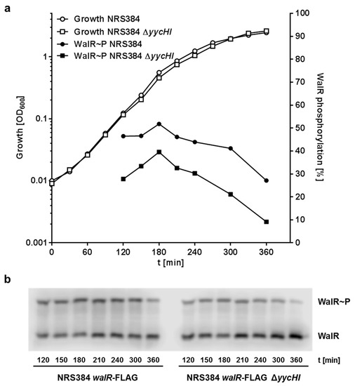 By using Phos-Tag SDS-PAGE in combination with immunoblotting, we were able to visualize the phosphorylation state of the FLAG-tagged WalR response regulator in lysates of growing S. aureus cells. The absence of YycH and YycI in S. aureus NRS384 walR-FLAG ΔyycHI caused WalR to be less phosphorylated throughout all growth stages, which indicates the importance of YycH and YycI. WalR phosphorylation peaked at the end of the log phase, which is consistent with work conducted in B. subtilis [5,41] and in S. aureus [9].