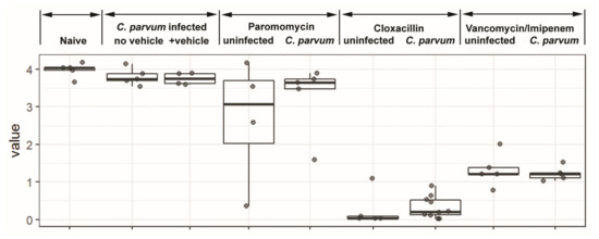 2.2. Cryptosporidium Parvum Mouse Infection and Antibiotic Treatment