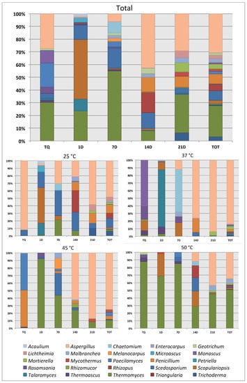 Percentage distribution by genera of filamentous fungi isolated during maturation period: total and detail for each temperature of incubation.