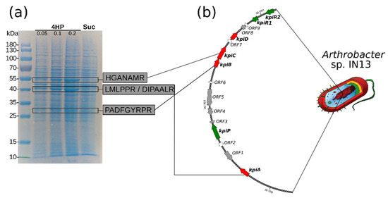 To identify genes encoding the catabolic enzymes, we extracted three 4HP-inducible proteins from SDS-PAGE and analyzed them using MS/MS sequencing (Figure 1a). All identified peptide sequences were searched against the partially sequenced genome of Arthrobacter sp. IN13. A contig containing all three 4HP-inducible genes was identified (MT469879). The gene cluster consisting of 16 open reading frames (ORF) was named the kpi locus (Figure 1b). The calculated molecular masses of kpiC-, kpiA-, and kpiB-encoded proteins (52.1, 41.4, 30.2 kDa, respectively) corresponded to molecular masses of proteins detected in the SDS-PAGE (52, 42, and 30 kDa, respectively) (Table 1). A comparative sequence analysis revealed that proteins encoded by ORF1, -4, and -5 were highly similar to transposases and integrases (Table 1). Moreover, two pseudogenes (ORF3 and ORF8) with incomplete gene sequences were detected in this cluster, according to their closest homologs. These data may suggest that the kpi locus evolved via a horizontal gene transfer, and is still in an early reorganization.