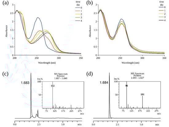 Bioconversion of 4HP in Rhodococcus erythropolis SQ1 transformed with recombinant pNit-kpiA plasmid (a,c), and wild-type R. erythropolis SQ1 (b,d). Cultures of R. erythropolis SQ1 were incubated in potassium phosphate buffer supplemented with 1 mM 4HP, and the UV-VIS absorption spectra were recorded (a,b). The lines represent the progress of the reaction (time in hours). The end reaction products (after 4 h) were analyzed by HPLC-MS (c,d).