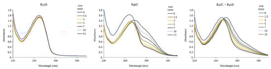 Bioconversion of 34DHP with the cell-free extracts of Escherichia. coli BL21 (DE3) expressing recombinant proteins (KpiB, KpiC, or both). The cell-free extracts were incubated in potassium phosphate buffer supplemented with 0.5 mM 34DHP, and the UV-VIS absorption spectra were recorded. The lines represent the progress of the reaction (time in minutes).