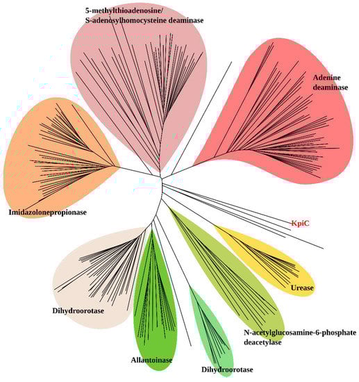 Phylogenetic analysis of KpiC in comparison with the selected enzymes from amidohydrolase family (Pfam01979). See Table S2 for the accession numbers of the enzymes used in this phylogenetic analysis.