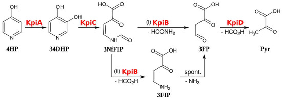 The kpi gene locus containing genes that are responsible for the catabolism of 4HP in Arthrobacter sp. IN13 was identified and characterized. The first reaction of 4HP degradation is catalyzed by a regiospecific flavin-dependent monooxygenase KpiA, and the product of this reaction is 34DHP. During the second step of the enzymatic degradation of 4HP, a fission of the pyridine ring is performed by a novel extradiol dioxygenase KpiC, which belongs to the amidohydrolase family. It can be speculated that the active site residues of the enzyme are probably rearranged to be able to catalyze an oxygenolytic ring fission reaction. The 3-(N-formyl)-formiminopyruvate formed is further converted to 3-formylpyruvate by KpiB hydrolase. It is more likely that KpiB is a deformylase, and 3-formiminopyruvate spontaneously hydrolyzes to 3-formylpyruvate. We propose that the last step in the metabolism of 4HP is executed by KpiD, which is homologous to fumarylacetoacetate hydrolases. In summary, our results render new fundamental knowledge about the degradation pathways of N-heterocyclic aromatic compounds and enrich the pool of enzymes that may be used in biocatalysis. Further studies are necessary for the detailed characterization of newly identified enzymes and their practical applications.