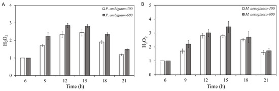Diurnal variations in the H2O2 contents of Phormidium. ambiguum (strain NIES 2119) (A) and Microcystis aeruginosa (strain NIES 111) (B). The numbers 300 and 600 represent the maximum photosynthetically active radiation (PAR) intensities (in µmol·m−2·s−1) for two different treatment conditions, where the maximum PAR intensity was reached at 12:00 h. The error bars represent the standard deviations.