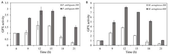 Diurnal variations in the guaiacol peroxidase (GPX) activities of P. ambiguum (strain NIES 2119) (A) and M. aeruginosa (strain NIES 111) (B). The numbers 300 and 600 represent the maximum PAR intensities (in µmol·m−2·s−1) for two different treatment conditions, where the maximum PAR intensity was reached at 12:00 h. The error bars represent the standard deviations.