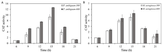 Diurnal variations in the catalase (CAT) activities of P. ambiguum (strain NIES 2119) (A) and M. aeruginosa (strain NIES 111) (B). The numbers 300 and 600 represent the maximum PAR intensities (in µmol·m−2·s−1) for two different treatment conditions, where the maximum PAR intensity was reached at 12:00 h. The error bars represent the standard deviations.