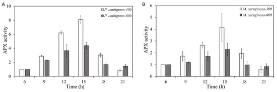 Diurnal variations in the ascorbic peroxidase (APX) activities of P. ambiguum (strain NIES 2119) (A) and M. aeruginosa (strain NIES 111) (B). The numbers 300 and 600 represent the maximum PAR intensities (in µmol·m−2·s−1) for two different treatment conditions, where the maximum PAR intensity was reached at 12:00 h. The error bars represent the standard deviations.