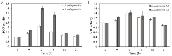 Diurnal variations in the super oxidase dismutase (SOD) activities of P. ambiguum (strain NIES 2119) (A) and M. aeruginosa (strain NIES 111) (B). The numbers 300 and 600 represent the maximum PAR intensities (in µmol·m−2·s−1) for two different treatment conditions, where the maximum PAR intensity was reached at 12:00 h. The error bars represent the standard deviations.