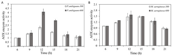 Diurnal variations in the total antioxidant (AOX) activity of P. ambiguum (strain NIES 2119) (A) and M. aeruginosa (strain NIES 111) (B). The numbers 300 and 600 represent the maximum PAR intensities (in µmol·m−2·s−1) for two different treatment conditions, where the maximum PAR intensity was reached at 12:00 h. The error bars represent the standard deviations.
