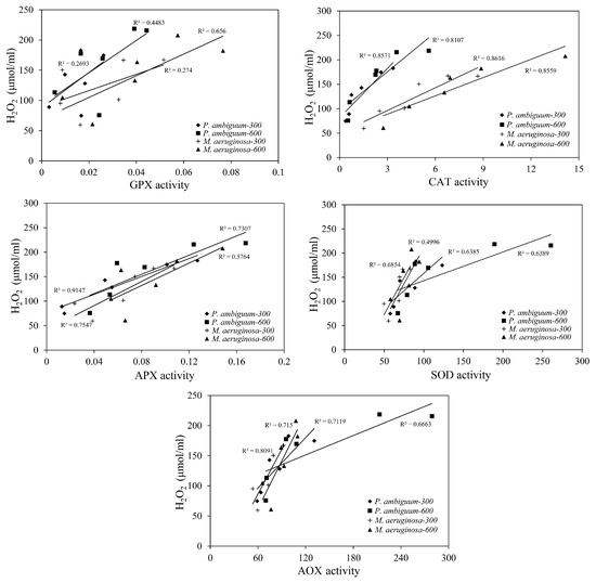 Linear regression relationships between the H2O2 contents and the antioxidant activities (GPX, CAT, APX, SOD, and AOX) of P. ambiguum (strain NIES 2119) and M. aeruginosa (strain NIES 111). The numbers 300 and 600 represent the maximum PAR intensities (in µmol·m−2·s−1) for two different treatment conditions, where the maximum PAR intensity was reached at 12:00 h.