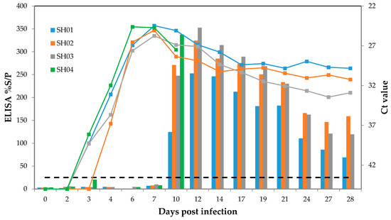 BTV RNA and antibody levels in BTV-14 infected sheep. Real-time RT-PCR Ct values are shown as coloured lines and seroconversion determined using ELISA shown as bars. The dashed line indicates the negative cut-off value of the ELISA.