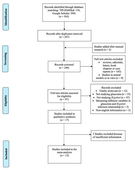 Studies were excluded if: the diagnosis of glaucoma was not clearly stated; the diagnosis of H. pylori infection was biased (e.g., patients recently treated with antibiotics or proton pump inhibitors); the data included incomplete and/or the corresponding author did not provide additional records; the publications did not contain original data, (e.g., letters to the editor, editorials, commentaries, reviews, meta-analyses); or if they evaluated fewer than seven points in the quality assessment process using the Newcastle–Ottawa scale (NOS).