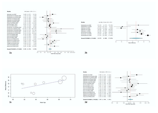 Comparison of the WMD of anti-H. pylori antibody titers between patients and controls gave a statistically significant difference (WMD 15.98 IU/mL); this was greater in glaucoma patients than in controls, albeit with high heterogeneity (p = 0.008, CI: 4.09–27.87, I2: 93.8%) (Figure 2b). Subgroup analysis could not explain the source of the heterogeneity. However, the meta-regression analysis proved that mean age had a statistically significant impact on the results (p = 0.037). More specifically, as Figure 2c illustrates, increasing age was associated with greater WMD of anti-H. pylori titers in glaucoma patients than in controls.