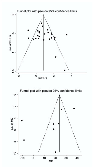 Funnel plot for both study models. Despite the non-significant Egger and Begg tests, there is a visual asymmetry in the funnel plots, indicative of a degree of publication bias. MD; weighted mean differences, OR; odds ratio, SE; standard error.