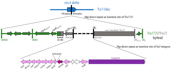 - Reid, C.J.; Roy Chowdhury, P.; Djordjevic, S.P. Tn6026 and Tn6029 are found in complex resistance regions mobilised by diverse plasmids and chromosomal islands in multiple antibiotic resistant Enterobacteriaceae. Plasmid 2015, 80, 127–137. [Google Scholar] [CrossRef]