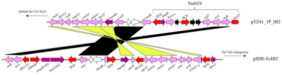 Pairwise alignment of the resistance locus in pTZ41_1P_HI2 and pSDE-SvHI2, highlighting regions of homology and differences.