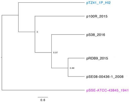 A BLASTn search using the IncHI2 ST4 pDLST-specific alleles as the query identified 14 ST4 plasmids sequences (Table S1, BLASTn search April 2019). In-silico PCR of the five target genes used for pDLST subtyping [20] showed an identical profile for all 14 entries including pTZ41_1P_HI2 (Table S2). However our SNP-based phylogeny analysis using pSSE-ATCC-43845, the oldest plasmid sequence (1941) reported in GenBank [1] revealed that only 6/14 plasmids shared ancestral relationships (Figure 4). The inference was based on alignment of all 6 plasmids over 49% of the length of reference plasmid with the recombination filtering mode turned on. pTZ41_1P_HI2 appeared to be a distinct plasmid lineage when compared to the rest of the plasmids sourced from Europe between 2008 and 2016. Although a limited number of complete plasmid sequences were available, our results indicate that the Australian ST4 lineage may have evolved distinctly. Nevertheless, we recommend that further sequencing of IncHI2 ST4 plasmids is needed to comprehend their distribution and phylogenetic associations in Australia.