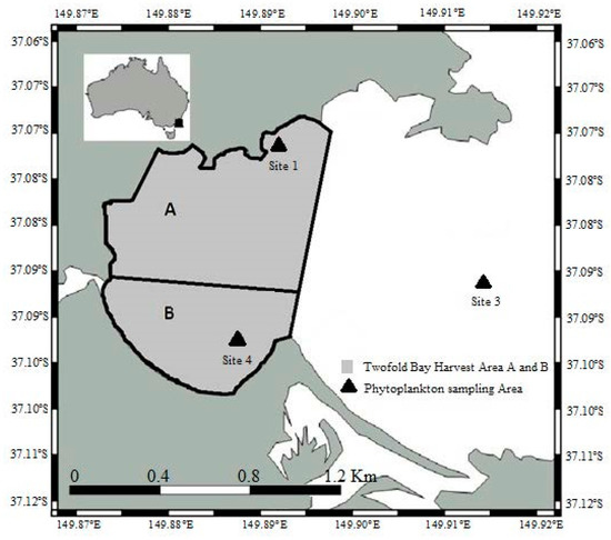 Two shellfish “harvest areas” have been designated within Twofold Bay, NSW (Figure 1A,B). Three water sample sites (designated as 1, 3 and 4, Figure 1) for phytoplankton identification and enumeration and two shellfish sample sites (one for each of the harvest zones, A and B, at aquaculture leases proximate to water sites 1 and 4, respectively, Figure 1) for biotoxin testing were established in relation to these harvest areas in Twofold Bay in accordance with the NSW Marine Biotoxin Management Plan (MBMP) and the Australian Shellfish Quality Assurance Program (ASQAP) Operation Manual [27,28]. During the harvest season, fortnightly phytoplankton and monthly biotoxin samplings were conducted at these sites [27] (Table S1). When phytoplankton cell concentrations were found to be above the specified phytoplankton action limits (PAL), and/or a report of a positive biotoxin test result occurred, the sampling frequency was increased to weekly and the initiatives like harvest area closure is taken if the cell count of species of Alexandrium exceeds the limit [27] (Table S2). For species of Alexandrium, a biotoxin test is triggered at 200 cells L−1, while a closure occurs at 500 cells L−1 [27].